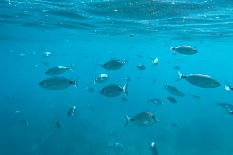 Około 3-godzinne przepłynięcie, aby dotrzeć na kontynent. Mieliśmy szczęście zobaczyć delfina 🤗 – jedynego podczas całego rejsu. Postój pod koniec przedpołudnia w przepięknej zatoce Ágios Nikólaos: pływanie, snorkeling, paddle… oraz pierwszy obiad na pokładzie przygotowany przez naszą hostessę Persę, wyjątkową kucharkę, która przez cały tydzień rozpieszczała nas pysznymi greckimi specjałami.”