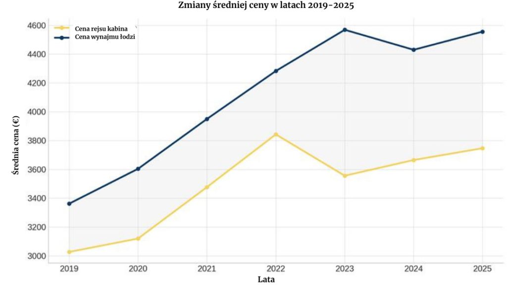 Warto zauważyć, że w latach 2019-2025 średnia cena wynajmu żaglówki wzrosła o 36%, z 3362 euro tygodniowo w 2019 roku do 4556 euro w 2025 roku! Wydaje się, że wzrost ten ustabilizował się od 2023 roku.