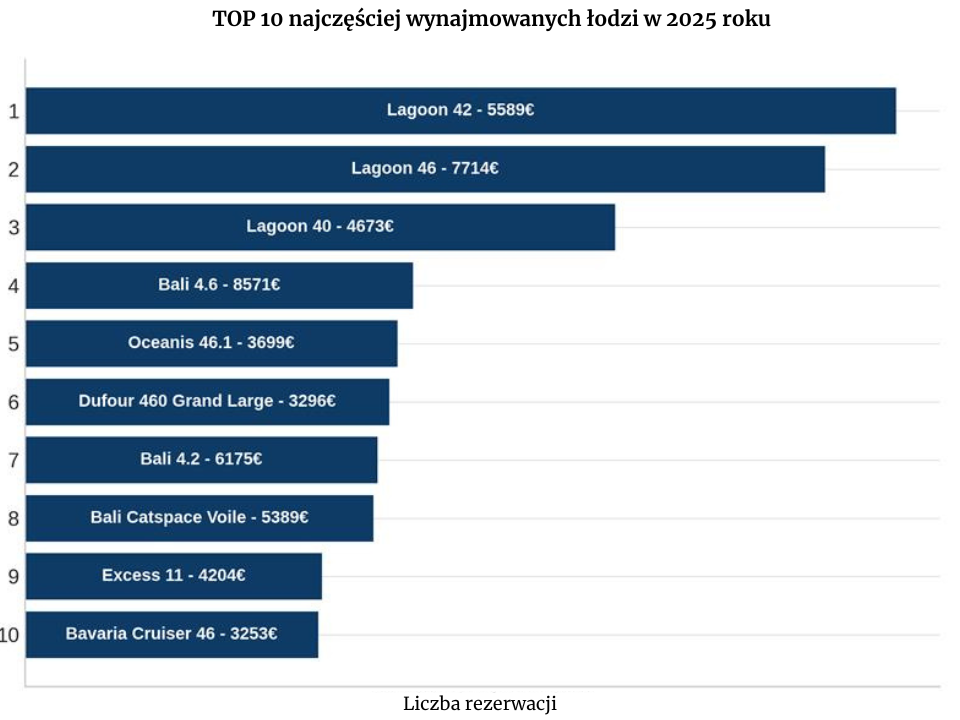Nic dziwnego, że katamarany dominują w rankingu najczęściej wynajmowanych łodzi w 2025 roku, z 7 katamaranami (Lagoon, Bali, Excess) i 3 łodziami jednokadłubowymi (Oceanis, Dufour, Bavaria) w pierwszej dziesiątce.