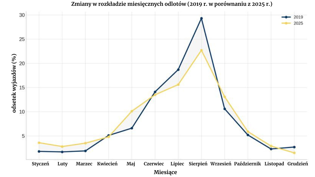 W 2019 r. wyjazdy w lipcu i sierpniu stanowiły 48,1% wszystkich wyjazdów w ciągu roku, podczas gdy w 2025 r. będzie to 38,3%, czyli o 10% mniej wyjazdów w sezonie letnim…!