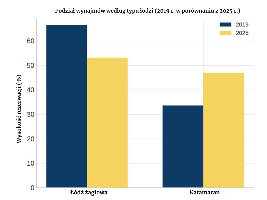 W 2019 r. rejsy katamaranem stanowiły 33,6% wszystkich rejsów, natomiast w 2025 r. będzie to już 46,9%, czyli prawie co drugi rejs odbywa się katamaranem.