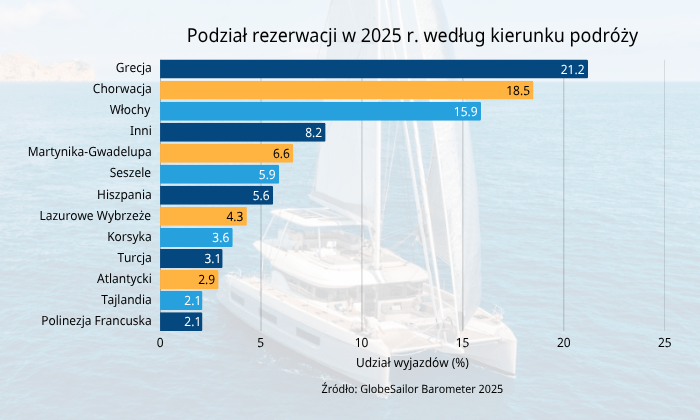 Grecja nadal zajmuje pierwsze miejsce w rankingu, za nią mieści się Chorwacja, a następnie Włochy. Te trzy rejony żeglarskie stanowią nieco ponad 50% najchętniej wybieranych destynacji na rejs w 2025 roku.